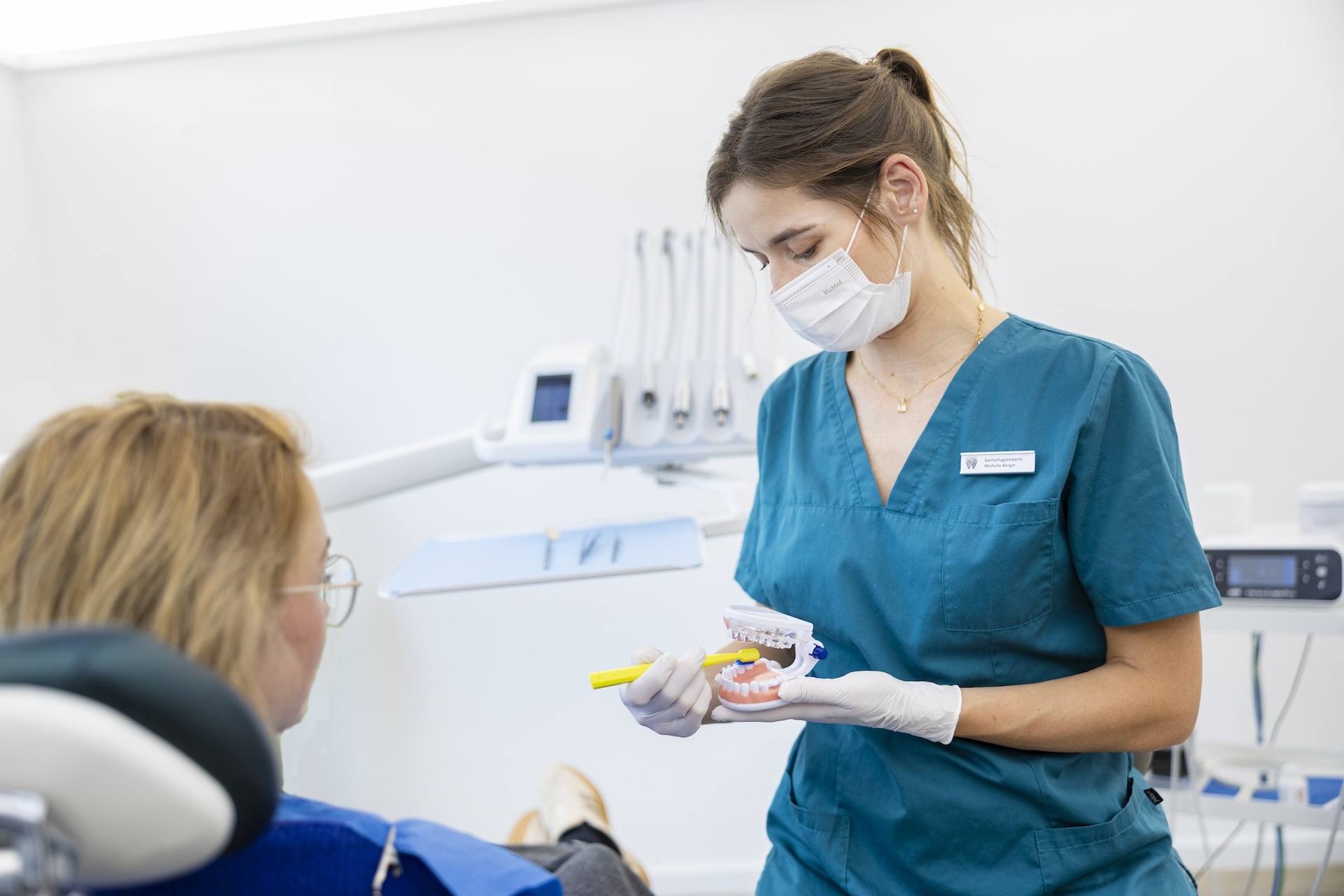 Haben Sie schon einmal über die Bedeutung von gesunden Zähnen nachgedacht? Wir sind der Meinung, dass die Zahnprophylaxe in jeder Zahnarztpraxis oberste Priorität haben sollte. Aber was versteht man eigentlich genau darunter? Die Zahnprophylaxe beinhaltet alle Maßnahmen, die dazu dienen, Erkrankungen der Zähne vorzubeugen. Hierzu zählen beispielsweise Karies, Parodontitis, Kiefergelenksbeschwerden und Zahnwurzelentzündungen. Diese Probleme zeigen sich oft erst, wenn die Zähne oder das umliegende Gewebe bereits größere Schäden genommen haben. Ziel der Zahnprophylaxe ist es daher, die Zähne und das Zahnfleisch vorbeugend zu schützen, bevor Schmerzen entstehen.